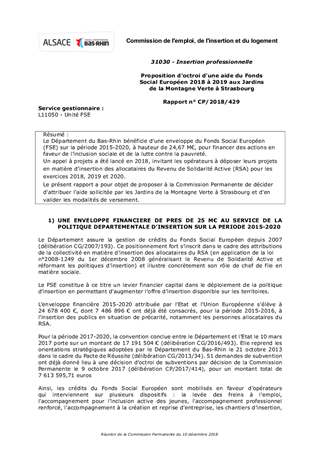 Le Département du Bas-Rhin bénéficie d’une enveloppe du Fonds Social Européen (FSE) sur la période 2015-2020, à hauteur de 24,67 M€, pour financer des actions en faveur de l’inclusion sociale et de la lutte contre la pauvreté. Un appel à projets a été lancé en 2018, invitant les opérateurs à déposer leurs projets en matière d’insertion des allocataires du Revenu de Solidarité Active (RSA) pour les exercices 2018, 2019 et 2020. Le présent rapport a pour objet de proposer à la Commission Permanente de décider d’attribuer l’aide sollicitée par les Jardins de la Montagne Verte à Strasbourg et d’en valider les modalités de versement.