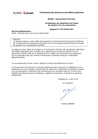 Le présent rapport a pour objet de proposer à la Commission Permanente de décider de la répartition des dotations cantonales et de l'enveloppe départementale du Fonds de soutien à la vie associative (FSVA).