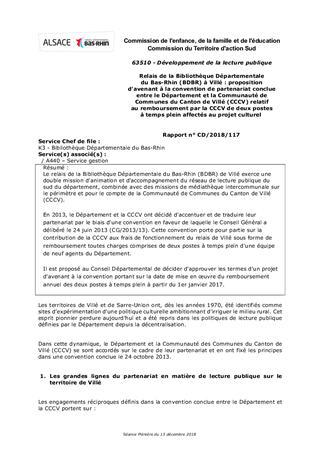Le relais de la Bibliothèque Départementale du Bas-Rhin (BDBR) de Villé exerce une double mission d'animation et d'accompagnement du réseau de lecture publique du sud du département, combinée avec des missions de médiathèque intercommunale sur le périmètre et pour le compte de la Communauté de Communes du Canton de Villé (CCCV). En 2013, le Département et la CCCV ont décidé d'accentuer et de traduire leur partenariat par le biais d'une convention en faveur de laquelle le Conseil Général a délibéré le 24 juin 2013 (CG/2013/13). Cette convention porte pour partie sur la contribution de la CCCV aux frais de fonctionnement du relais de Villé sous forme de remboursement toutes charges comprises de deux postes à temps plein d'une équipe de neuf agents du Département. Il est proposé au Conseil Départemental de décider d'approuver les termes d'un projet d'avenant à la convention portant sur la date de mise en œuvre du remboursement annuel des deux postes à temps plein à partir du 1er janvier 2017.