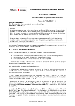 Le présent rapport a pour objet de présenter au Conseil Départemental l'ensemble des recettes de fiscalité directe et indirecte qu'il est proposé d'inscrire au budget primitif 2019 du budget principal, et propose au Conseil Départemental de décider de diminuer pour 2019 le taux de la taxe foncière sur les propriétés bâties. En vertu d'une obligation réglementaire, un rapport doit en effet individualiser les recettes fiscales et mentionner certains taux d'imposition, en particulier celui de la taxe foncière sur les propriétés bâties.