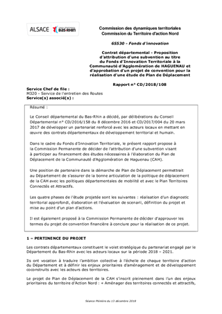 Le Conseil départemental du Bas-Rhin a décidé, par délibérations du Conseil Départemental n° CD/2016/158 du 8 décembre 2016 et CD/2017/004 du 20 mars 2017 de développer un partenariat renforcé avec les acteurs locaux en mettant en œuvre des contrats départementaux de développement territorial et humain. Dans le cadre du Fonds d'Innovation Territoriale, le présent rapport propose à la Commission Permanente de décider de l'attribution d'une subvention visant à participer au financement des études nécessaires à l’élaboration du Plan de Déplacement de la Communauté d’Agglomération de Haguenau (CAH). Une position de partenaire dans la démarche de Plan de Déplacement permettrait au Département de s'assurer de la bonne articulation de la politique de déplacement de la CAH avec les politiques départementales de mobilité et avec le Plan Territoires Connectés et Attractifs. Les quatre phases de l’étude projetée sont les suivantes : réalisation d’un diagnostic territorial approfondi, élaboration et l’évaluation de scenarii, définition du projet et mise au point d’un plan d’actions. Il est également proposé à la Commission Permanente de décider d'approuver les termes du projet de convention financière à conclure pour la réalisation de ce projet.