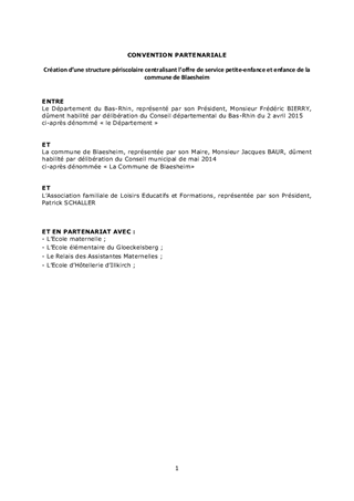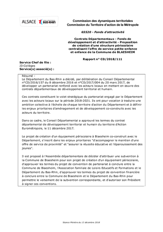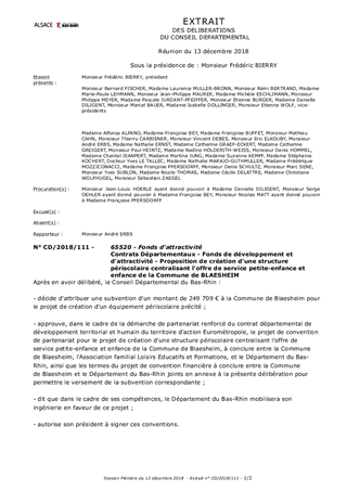 Le Département du Bas-Rhin a décidé, par délibération du Conseil Départemental n°CD/2016/157 du 8 décembre 2016 et n°CD/2017/004 du 20 mars 2017, de développer un partenariat renforcé avec les acteurs locaux en mettant en œuvre des contrats départementaux de développement territorial et humain. Ces contrats constituent le volet stratégique du partenariat engagé par le Département avec les acteurs locaux sur la période 2018-2021. Ils ont pour vocation à traduire une ambition collective à l'échelle de chaque territoire d'action du Département et à définir les enjeux prioritaires d'aménagement et de développement co-construits avec les acteurs du territoire. Dans ce cadre, le Conseil Départemental a approuvé les termes du contrat départemental de développement territorial et humain du territoire d'Action Eurométropole, le 11 décembre 2017. Le projet de création d'un équipement périscolaire à Blaesheim co-construit avec le Département, s'inscrit dans les enjeux prioritaires "d'accompagner le maintien d'une offre de service de proximité" et "assurer la réussite éducative et l'épanouissement des jeunes". Il est proposé à l'Assemblée départementale de décider d'attribuer une subvention à la Commune de Blaesheim pour son projet de création d'un équipement périscolaire, d'approuver les termes du projet de convention de partenariat à conclure entre la Commune de Blaesheim, l'Association familiale de Loisirs Educatifs et Formations et le Département du Bas-Rhin, d'approuver les termes du projet de convention financière à conclure entre la Commune de Blaesheim et le Département du Bas-Rhin pour permettre le versement de la subvention correspondante, et d'autoriser son Président à signer ces conventions.