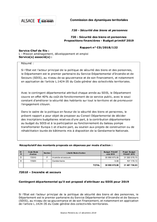 Si l’Etat est l’acteur principal de la politique de sécurité des biens et des personnes, le Département est le premier partenaire du Service Départemental d’Incendie et de Secours (SDIS), au niveau de sa gouvernance et de son financement, et notamment en application de l’article L.1424-35 du Code général des collectivités territoriales. Avec le contingent départemental attribué chaque année au SDIS, le Département couvre en effet 40% du coût de fonctionnement de ce service public, avec le souci constant d’améliorer la sécurité des habitants sur tout le territoire et de promouvoir l’engagement citoyen. Dans le cadre de la politique en faveur de la sécurité des biens et personnes, le présent rapport a pour objet de proposer au Conseil Départemental de décider des inscriptions budgétaires relatives d'une part, à la contribution départementale au budget du SDIS et à la participation au fonctionnement du bateau pompe transfrontalier Europa 1 et d'autre part, au soutien aux projets de construction ou de réhabilitation lourde de bâtiments mis à disposition de la Gendarmerie Nationale.