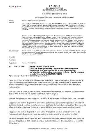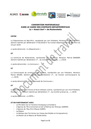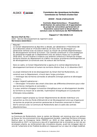 Le Conseil départemental du Bas-Rhin a décidé, par délibération n°CD/2016/158 du 8 décembre 2016 et n°CD/2017/004 du 20 mars 2017 de développer un partenariat renforcé avec les acteurs locaux au moyen de contrats départementaux de développement territorial et humain. Ces contrats constituent le volet stratégique du partenariat engagé par le Département avec les acteurs locaux sur la période 2018-2021. Ils ont vocation à traduire une ambition collective à l’échelle de chaque territoire d’action du département et à définir les enjeux prioritaires d’aménagement et de développement co-construits avec les acteurs des territoires. Dans ce cadre, le Conseil Départemental a approuvé le contrat départemental de développement territorial et humain du territoire d’Action Sud, le 11 décembre 2017. Le projet d’attractivité et de développement du Smart Dorf de Muttersholtz, co-construit avec le Département, s’inscrit dans l’enjeu prioritaire : - « Aménager des territoires connectés et attractifs à énergie positive et développer l’emploi », et dans l’objectif opérationnel : - « Développer l’innovation des smart cities dans ses différentes dimensions pour créer des territoires intelligents et connectés ». Il a pour ambition d’engager la transition énergétique pour un développement durable du territoire au moyen de la sobriété, l'optimisation énergétiques et la production d’énergies renouvelables. Le présent rapport propose au Conseil Départemental de décider d'attribuer une subvention au titre du Fonds d'Attractivité et de Développement ainsi que d'approuver les termes du projet de convention partenariale et financière concernant le Smart Dorf à conclure avec la Commune de Muttersholtz dans le cadre des contrats départementaux.