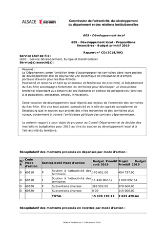 Le Département porte l'ambition forte d'accompagner les territoires dans leurs projets de développement afin de poursuivre une dynamique de croissance et d'emploi porteuse d'avenir pour les Bas-Rhinois. Positionné et reconnu en tant qu’animateur et fédérateur de proximité, le Département du Bas-Rhin accompagne fortement les territoires pour développer un écosystème territorial répondant aux besoins de ses habitants et porteur de perspectives (services à la population, croissance, emploi, innovation). Cette vocation de développement local répond aux enjeux de l’ensemble des territoires du Bas-Rhin. Elle vise tout autant l’attractivité et le rôle de capitale européenne de Strasbourg que le soutien aux projets des villes moyennes et des territoires plus ruraux, notamment à travers l’ambitieuse politique des contrats départementaux. Le présent rapport a pour objet de proposer au Conseil Départemental de décider des inscriptions budgétaires pour 2019 au titre du soutien au développement local et à l'attractivité du territoire.