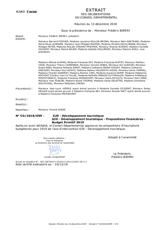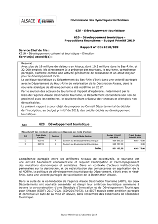 Avec plus de 19 millions de visiteurs en Alsace, dont 10,5 millions dans le Bas-Rhin, et 22 000 emplois liés directement à la présence des touristes, le tourisme, compétence partagée, s’affirme comme une activité génératrice de croissance et un atout majeur pour le développement local. La politique touristique du Département du Bas-Rhin s’écrit dans une volonté partagée avec le Département du Haut-Rhin de valorisation de la Destination Alsace, dont la nouvelle stratégie de développement a été redéfinie en 2017. Par le soutien des acteurs du tourisme et l’apport d’ingénierie, notamment par le biais de l’agence Alsace Destination Tourisme, le Département consolidera son lien de proximité avec les territoires, le tourisme étant créateur de richesses et d’emplois non délocalisables. Le présent rapport a pour objet de proposer au Conseil Départemental de décider de l'inscription, au budget primitif de 2019, des crédits dédiés au développement touristique.