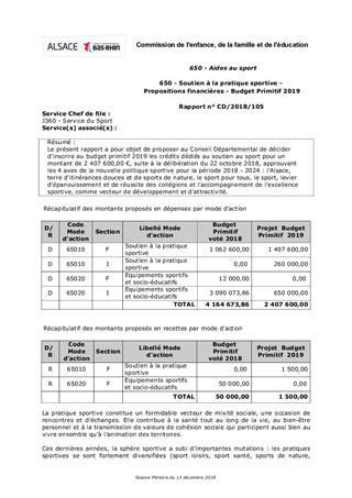 Le présent rapport a pour objet de proposer au Conseil Départemental de décider d'inscrire au budget primitif 2019 les crédits dédiés au soutien au sport pour un montant de 2 407 600,00 €, suite à la délibération du 22 octobre 2018, approuvant les 4 axes de la nouvelle politique sportive pour la période 2018 - 2024 : l’Alsace, terre d'itinérances douces et de sports de nature, le sport pour tous, le sport, levier d'épanouissement et de réussite des collégiens et l’accompagnement de l'excellence sportive, comme vecteur de développement et d’attractivité.
