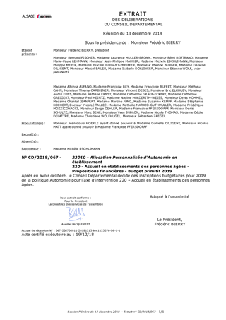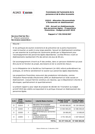 Si les politiques de soutien à domicile et de prévention de la perte d’autonomie visent à toucher un public le plus large possible, l’accueil en établissement constitue un axe essentiel de la politique de l’autonomie portée par le Département pour l’accompagnement des personnes âgées dépendantes. Les Bas-Rhinois vivant en établissements représentent 4% des séniors de plus de 60 ans. Cet accompagnement s’inscrit au fil des années, dans un parcours résidentiel qui peut être pluriel en fonction du projet, des besoins et de la volonté de chacun. La loi d’Adaptation de la Société au Vieillissement (loi ASV) refond profondément les pratiques, et renforce sensiblement le soutien aux personnes âgées dépendantes. Les propositions financières recouvrent des prestations individuelles, comme l’Allocation Personnalisée d’Autonomie (APA) en établissement et l’aide sociale en établissement. L’accueil familial constitue une réponse, que le Département cherche à développer, qualitativement et quantitativement. Le présent rapport a pour objet de proposer de décider de l'inscription au budget primitif 2019 des crédits correspondant à la politique d’accueil en établissement des personnes âgées.