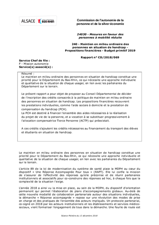 Le maintien en milieu ordinaire des personnes en situation de handicap constitue une priorité pour le Département du Bas-Rhin, ce qui nécessite une approche individuelle et qualitative de la situation de chaque usager, en lien avec les partenaires du Département sur le terrain. Le présent rapport a pour objet de proposer au Conseil Départemental de décider de l'inscription des crédits consacrés à la politique de maintien en milieu ordinaire des personnes en situation de handicap. Les propositions financières recouvrent les prestations individuelles, comme l’aide sociale à domicile et la prestation de compensation du handicap (PCH). La PCH est destiné à financer l'ensemble des aides nécessaires à la réalisation du projet de vie de la personne, et a vocation à se substituer progressivement à l'allocation compensatrice Tierce Personne (ACTP) qui préexistait. A ces crédits s’ajoutent les crédits nécessaires au financement du transport des élèves et étudiants en situation de handicap.