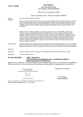 L’école constitue le creuset de la République. Elle est le lieu d’apprentissage et d’acquisition de connaissances ainsi que des valeurs de la République. Elle joue un rôle fondamental de socialisation, d’ouverture sur le monde et constitue le socle de la vie en société. Dans le cadre de son action, le Département agit sur des leviers fondamentaux pour la jeunesse : le développement de la citoyenneté, la créativité et l’esprit critique, l’apprentissage de capacités à choisir, agir et oser par soi-même. C’est dans cet esprit que l’Exécutif départemental souhaite que le Département du Bas-Rhin exerce ses missions auprès des 52 856 collégiens des collèges publics et privés. L’enjeu est bien de mobiliser l’ensemble des énergies afin d’aider les collégiens d’une part à acquérir les repères et les fondamentaux de la vie d’adulte et d’autre part à développer les qualités essentielles pour s’insérer et s’épanouir dans le monde d’aujourd’hui, et ainsi devenir les citoyens de demain. Dans le cadre d’une stratégie partenariale et territoriale, la politique de l’Education du Bas-Rhin proposée dans le présent rapport vise à apporter des réponses aux besoins fondamentaux à la construction des adultes et citoyens de demain.
