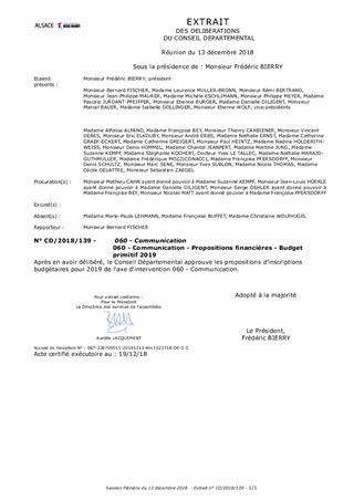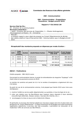 Le présent rapport a pour objet de proposer au Conseil Départemental de décider des crédits relatifs à l'axe d'intervention 060 - Communication pour le Budget primitif 2019.