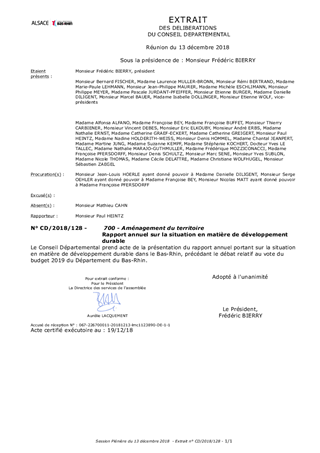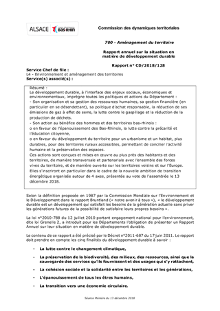 Le développement durable, à l’interface des enjeux sociaux, économiques et environnementaux, imprègne toutes les politiques et actions du Département : - Son organisation et sa gestion des ressources humaines, sa gestion financière (en particulier en se désendettant), sa politique d’achat responsable, la réduction de ses émissions de gaz à effet de serre, la lutte contre le gaspillage et la réduction de la production de déchets. - Son action au bénéfice des hommes et des territoires bas-rhinois : o en faveur de l’épanouissement des Bas-Rhinois, la lutte contre la précarité et l’éducation citoyenne, o en faveur du développement du territoire pour un urbanisme et un habitat, plus durables, pour des territoires ruraux accessibles, permettant de concilier l’activité humaine et la préservation des espaces. Ces actions sont conçues et mises en œuvre au plus près des habitants et des territoires, de manière transversale et partenariale avec l’ensemble des forces vives du territoire, et de manière ouverte sur les territoires voisins et sur l’Europe. Elles s'inscriront en particulier dans le cadre de la nouvelle ambition de transition énergétique organisée autour de 4 axes, présentée au vote de l'assemblée le 13 décembre 2018.