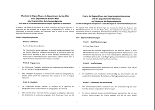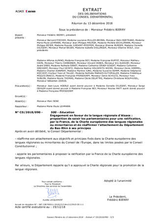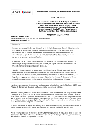 Lors de la séance plénière du 22 octobre 2018, le Président du Conseil Départemental a proposé à l’Assemblée de saisir les parlementaires afin qu’ils proposent une ratification, par la France, de la charte européenne des langues régionales ou minoritaires. La prochaine réforme constitutionnelle offre, de surcroît, un cadre juridique favorable à cette ratification. L’adoption par le Conseil Départemental du Bas-Rhin, lors de la même séance, de la Stratégie Bilinguisme constitue, par ailleurs, un signal fort de l'attachement du Département à la langue régionale d'Alsace. Soucieux de promouvoir le patrimoine matériel et immatériel de son territoire et conscient que l’existence et la transmission des langues régionales constituent un atout en faveur du bilinguisme, le Conseil Départemental du Bas-Rhin réaffirme, par le présent rapport, son attachement aux objectifs et principes fixés dans la Charte européenne des langues régionales ou minoritaires du Conseil de l'Europe.