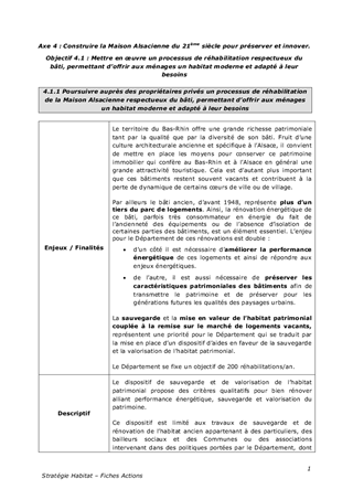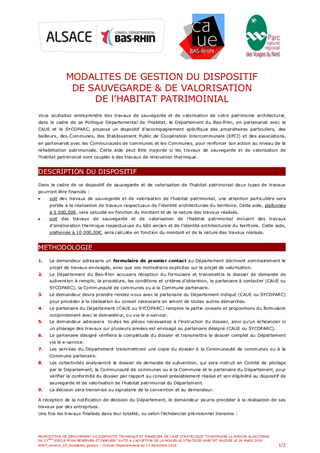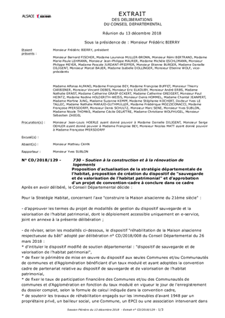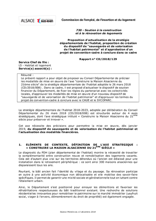 Le présent rapport a pour objet de proposer au Conseil Départemental de préciser les modalités de mise en œuvre de l'axe "construire la Maison Alsacienne du 21ème siècle" de la stratégie départementale de l’habitat adoptée le 26 mars 2018 (CD/2018/008) . Dans ce cadre, il est proposé d’actualiser le dispositif de soutien financier du Département, de fixer les règles du partenariat avec les collectivités locales, d’approuver les modalités de mise en œuvre d'un nouveau dispositif de "sauvegarde et de valorisation de l'habitat patrimonial" et d’approuver les termes du projet de convention-cadre à conclure avec le CAUE et le SYCOPARC.