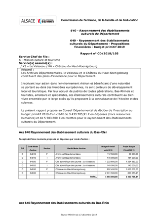 Les Archives Départementales, le Vaisseau et le Château du Haut-Koenigsbourg constituent des pôles d'excellence pour le Département. Inscrivant leur action dans l'environnement rhénan et bénéficiant d'une notoriété se portant au-delà des frontières européennes, ils sont porteurs de développement local et touristique. Par leur accueil de publics de toutes générations, Bas-Rhinois et touristes, amateurs et spécialistes, ces établissements culturels contribuent au bien-vivre ensemble par le large accès qu'ils proposent à la connaissance de l'histoire et des sciences. Le présent rapport propose au Conseil Départemental de décider de l’inscription au budget primitif 2019 d’un crédit de 3 433 705,91 € en dépenses (hors ressources humaines) et de 5 503 800 € en recettes pour le rayonnement des établissements culturels du Département.