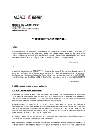 Le présent rapport propose à la Commission Permanente de décider d'attribuer 4 920 € TTC au cabinet d'architecture ARCHETYPE et d'approuver les termes du projet de protocole transactionnel à conclure avec le cabinet d’architecture ARCHETYPE concernant l'exécution du marché de maitrise d’œuvre dans le cadre du projet de création d’un parking aérien à l’Hôtel du département à Strasbourg, et d'autoriser son président à signer ce protocole.