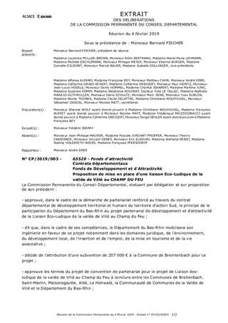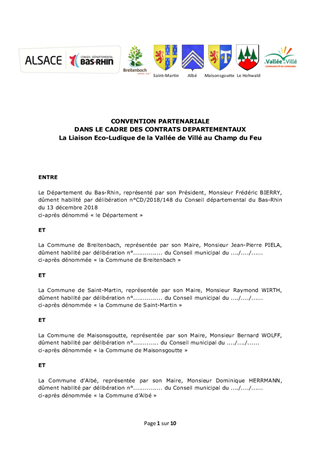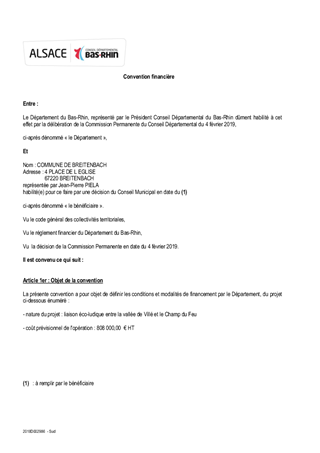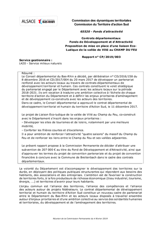 Le Conseil départemental du Bas-Rhin a décidé, par délibération n° CD/2016/158 du 8 décembre 2016 et CD/2017/004 du 20 mars 2017 de développer un partenariat renforcé avec les acteurs locaux au travers de contrats départementaux de développement territorial et humain. Ces contrats constituent le volet stratégique du partenariat engagé par le Département avec les acteurs locaux sur la période 2018-2021. Ils ont vocation à traduire une ambition collective à l’échelle de chaque territoire d’action du Département et à définir les enjeux prioritaires d’aménagement et de développement co-construits avec les acteurs des territoires. Dans ce cadre, le Conseil départemental a approuvé le contrat départemental de développement territorial et humain du territoire d’Action Sud, le 11 décembre 2017. Le projet de Liaison Eco-ludique de la vallée de Villé au Champ du Feu, co-construit avec le Département s’inscrit dans les enjeux prioritaires : - Développer les sites de tourismes et de loisirs, notamment par une meilleure mobilité, - Conforter les filières courtes et d’excellence. Il a pour ambition de renforcer l’attractivité "quatre saisons" du massif du Champ du Feu et de renforcer les liens entre le Champ du Feu et ses vallées adjacentes. Le présent rapport propose à la Commission Permanente de décider d'attribuer une subvention de 207 000 € au titre du Fond de Développement et d'Attractivité, ainsi que d'approuver les termes du projet de convention partenariale et du projet de convention financière à conclure avec la Commune de Breitenbach dans le cadre des contrats départementaux.