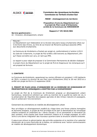 Le Département suit l’élaboration et la révision des plans locaux d’urbanisme (PLU) sur le territoire bas-rhinois, au titre de sa mission de Personne publique associée (PPA) aux documents d’urbanisme. La Commune de Hindisheim a finalisé son projet et, conformément à l'article L123-9 du code de l’urbanisme, le projet de PLU arrêté a été transmis au Département, afin qu’il fasse connaître son avis, en tant que PPA. Le rapport a pour objet de proposer à la Commission Permanente de décider d’adopter le projet d’avis du Département sur le projet de PLU et d’approuver les remarques qu'il est proposé de formuler.