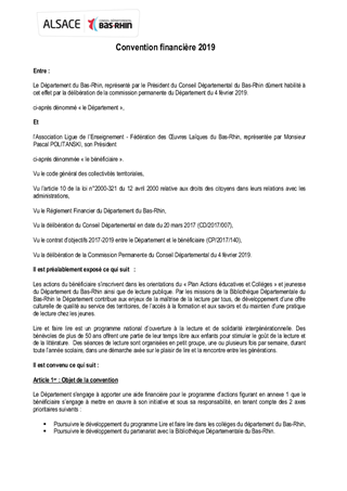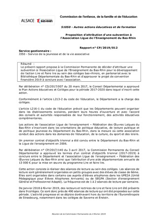 Le présent rapport propose à la Commission Permanente de décider d’attribuer une subvention à l’Association Ligue de l’Enseignement du Bas-Rhin pour le développement de l’action Lire et Faire lire au sein des collèges bas-rhinois, en partenariat avec la Bibliothèque Départementale du Bas-Rhin et d'approuver le projet de convention financière 2019 à conclure avec l'association.