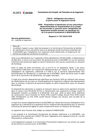 Le présent rapport a pour objet de proposer à la Commission Permanente de décider de l’attribution d’une subvention suite à la demande d’aide financière présentée par la SOCONEC pour l’adaptation d’un logement situé à Bischwiller, et d’approuver les termes du projet de convention à conclure.