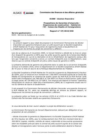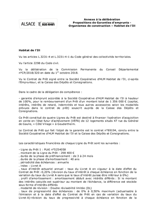 Le présent rapport a pour objet de proposer à la Commission Permanente de décider d’accorder une garantie d’emprunt pour un prêt souscrit par la Société Coopérative d’HLM Habitat de l’Ill pour l’acquisition de logements situés à Geudertheim et d'approuver les termes du projet de convention y afférent.