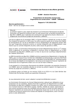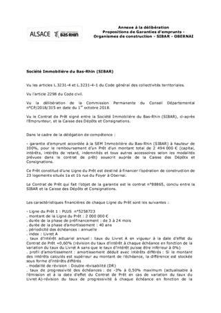 Le présent rapport a pour objet de proposer à la Commission Permanente de décider d’accorder une garantie d’emprunt pour un prêt souscrit par la Société Immobilière du Bas-Rhin (SIBAR) pour l’opération de construction de logements situés à Obernai et d'approuver les termes du projet de convention y afférent.