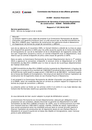 Le présent rapport a pour objet de proposer à la Commission Permanente de décider d’accorder une garantie d’emprunt pour un prêt souscrit par la Société Immobilière du Bas-Rhin (SIBAR) pour l’opération de construction de logements situés à Wasselonne et d'approuver les termes du projet de convention y afférent.