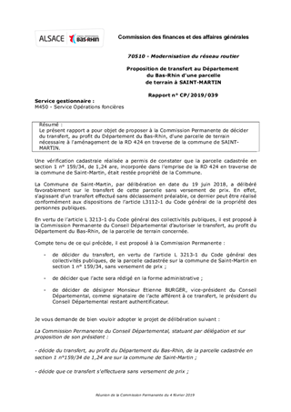Le présent rapport a pour objet de proposer à la Commission Permanente de décider du transfert, au profit du Département du Bas-Rhin, d'une parcelle de terrain nécessaire à l'aménagement de la RD 424 en traverse de la commune de SAINT-MARTIN.