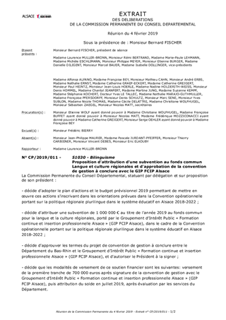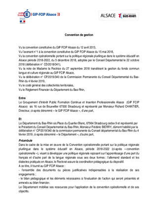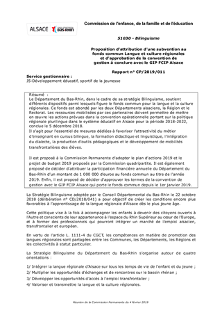 Le Département du Bas-Rhin, dans le cadre de sa stratégie Bilinguisme, soutient différents dispositifs parmi lesquels figure le fonds commun pour la langue et la culture régionales. Ce fonds est abondé par les deux Départements alsaciens, la Région et le Rectorat. Les ressources mobilisées par ces partenaires doivent permettre de mettre en œuvre les actions prévues dans la convention opérationnelle portant sur la politique régionale plurilingue dans le système éducatif en Alsace pour la période 2018-2022, conclue le 5 décembre 2018. Il s’agit pour l’essentiel de mesures dédiées à favoriser l’attractivité du métier d’enseignant en cursus bilingue, la formation didactique et linguistique, l’intégration du dialecte, la production d’outils pédagogiques et le développement de mobilités transfrontalières des élèves. Il est proposé à la Commission Permanente d'adopter le plan d'actions 2019 et le projet de budget 2019 proposés par la Commission quadripartite. Il est également proposé de décider d'attribuer la participation financière annuelle du Département du Bas-Rhin d'un montant de 1 000 000 d'euros au fonds commun au titre de l'année 2019. Enfin, il est proposé de décider d'approuver les termes de la convention de gestion avec le GIP FCIP Alsace qui porte le fonds commun depuis le 1er janvier 2019.