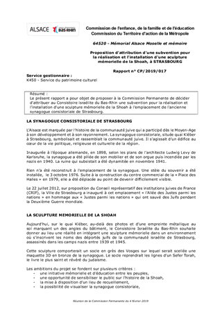 Le présent rapport a pour objet de proposer à la Commission Permanente de décider d'attribuer au Consistoire israélite du Bas-Rhin une subvention pour la réalisation et l'installation d'une sculpture mémorielle de la Shoah à l'emplacement de l'ancienne synagogue consistoriale de Strasbourg.