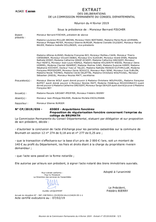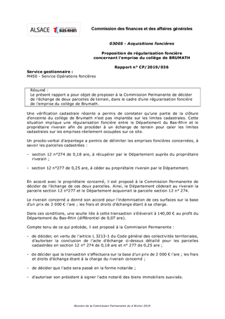 Le présent rapport a pour objet de proposer à la Commission Permanente de décider de l'échange de deux parcelles de terrain, dans le cadre d'une régularisation foncière de l'emprise du collège de Brumath.