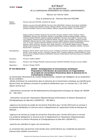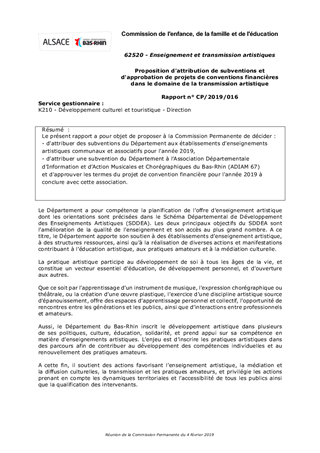 Le présent rapport a pour objet de proposer à la Commission Permanente de décider : - d'attribuer des subventions du Département aux établissements d'enseignements artistiques communaux et associatifs pour l'année 2019, - d'attribuer une subvention du Département à l’Association Départementale d’Information et d’Action Musicales et Chorégraphiques du Bas-Rhin (ADIAM 67) et d'approuver les termes du projet de convention financière pour l'année 2019 à conclure avec cette association.