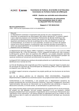 Le Département contribue à l'autonomie des jeunes et à leur engagement en soutenant les associations qui développent des actions éducatives. Le présent rapport a pour objet de proposer à la Commission Permanente de décider d'attribuer des subventions à des associations menant des actions sur des territoires en difficulté (quartiers prioritaires au titre de la politique de la ville), privilégiant le travail sur le comportement, la civilité et le vivre ensemble, le travail sur la notion de respect mutuel entre filles et garçons, la prévention des violences sexistes et sexuelles, la notion de responsabilisation et la solidarité locale ou internationale dans le cadre du dispositif Ville Vie Vacances.