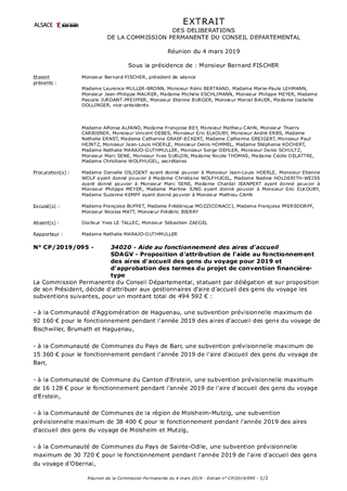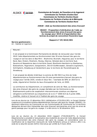 Il est proposé à la Commission Permanente de décider de renouveler pour l’année 2019 l'aide départementale au fonctionnement des 20 aires d'accueil des gens du voyage en service dans le Bas-Rhin : Bischwiller, Brumath, Haguenau pour le territoire Nord, Barr, Erstein, Molsheim, Mutzig, Obernai, Sélestat dans le territoire Sud, Saverne et Wasselonne dans le territoire Ouest, Bischheim-Hœnheim-La Wantzenau, Eckbolsheim, Fegersheim, Geispolsheim, Illkirch-Graffenstaden, Ostwald-Lingolsheim, Schiltigheim, Strasbourg et Vendenheim pour le territoire de l'Eurométropole de Strasbourg. Il est proposé de décider d'attribuer la somme de 494 592 € au titre de l'aide départementale au fonctionnement des 20 aires permanentes d'accueil des gens du voyage pour l'année 2019, versée en deux fois : l'acompte de 50% en 2019 et le solde, régularisé en fonction du taux d'occupation de l'aire, en 2020. La contribution du Département, en complément de celle de l’Etat, au fonctionnement des aires d'accueil des gens du voyage réalisées par les Communes ou les Etablissements publics de coopération intercommunale constitue une dépense obligatoire conformément aux dispositions de la loi n° 2000-614 du 5 juillet 2000, modifiée, relative à l’accueil et à l’habitat des gens du voyage.