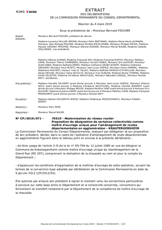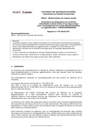 Le présent rapport a pour objet de proposer à la Commission Permanente de désigner la Commune de Krautergersheim comme maître d’ouvrage unique pour l’aménagement d’une route départementale en agglomération, chargée à ce titre d’exercer les attributions relevant de la maîtrise d’ouvrage pour la chaussée départementale concernée. Il vise à autoriser le président du Conseil Départemental à signer la convention à conclure entre cette collectivité et le Département. Cette convention a pour objet la désignation du maître d’ouvrage unique pour cette opération.
