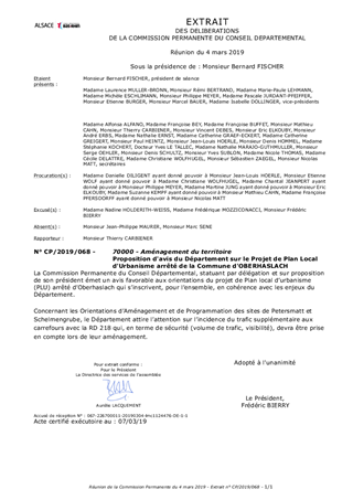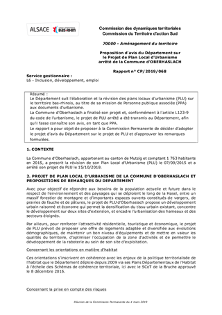 Le Département suit l’élaboration et la révision des plans locaux d’urbanisme (PLU) sur le territoire bas-rhinois, au titre de sa mission de Personne publique associée (PPA) aux documents d’urbanisme. La Commune d’Oberhaslach a finalisé son projet et, conformément à l'article L123-9 du code de l’urbanisme, le projet de PLU arrêté a été transmis au Département, afin qu’il fasse connaître son avis, en tant que PPA. Le rapport a pour objet de proposer à la Commission Permanente de décider d’adopter le projet d’avis du Département sur le projet de PLU et d’approuver les remarques formulées.
