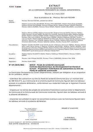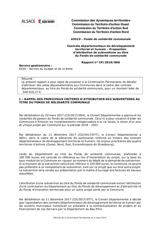 Le présent rapport a pour objet de proposer à la Commission Permanente de décider d’attribuer des aides départementales aux Communes dans le cadre des contrats départementaux, au titre du Fonds de solidarité communale, pour un montant total de 348 910,17 €.