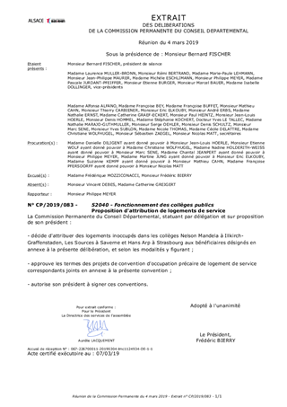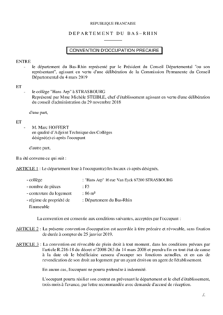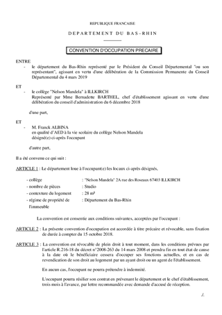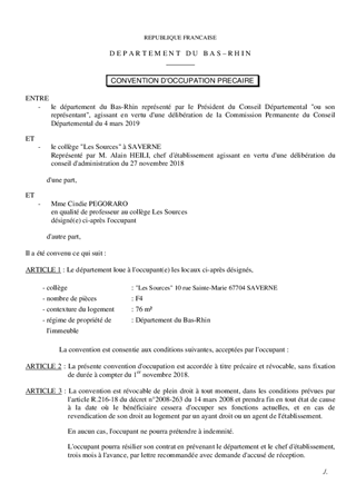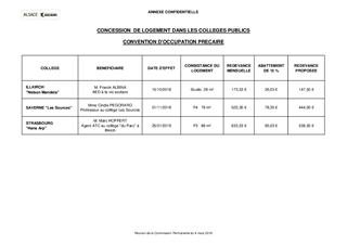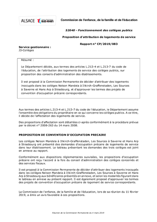 Le Département décide, aux termes des articles L.213-4 et L.213-7 du code de l'éducation, de l'attribution des logements de service des collèges publics, sur proposition des conseils d'administration des établissements. Il est proposé à la Commission Permanente de décider d'attribuer des logements inoccupés dans les collèges Nelson Mandela à Illkirch-Graffenstaden, Les Sources à Saverne et Hans Arp à Strasbourg, et d'approuver les termes des projets de convention d'occupation précaire correspondants.