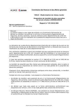 Le présent rapport a pour objet de proposer à la Commission Permanente de décider du transfert, au profit de la voirie de la Communauté d'Agglomération de Haguenau, de deux parcelles, issues du domaine public départemental de la RD 421 à Bernolsheim suite à la réalisation de la plateforme départementale d'activités de la région de Brumath.