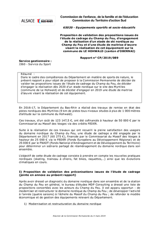 Dans le cadre des compétences du Département en matière de sports de nature, le présent rapport a pour objet de proposer à la Commission Permanente de décider de valider les propositions issues de l’étude de cadrage du Champ du Feu, de décider d’engager la réalisation dès 2020 d’un stade nordique sur le site des Myrtilles (commune de Le Hohwald) et de décider d’engager en 2019 une étude de maitrise d’œuvre visant la réalisation de cet équipement.