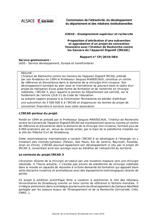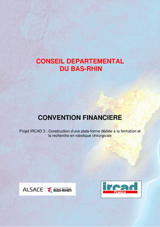L'Institut de Recherche contre les Cancers de l'Appareil Digestif IRCAD, présidé par son fondateur en 1994 le Professeur Jacques MARESCAUX, constitue un centre de référence et d'excellence dans le domaine de la chirurgie mini-invasive. Son développement constant au plan local et international se poursuit dans le cadre d'un projet de réalisation d'une plate-forme de formation et de recherche en chirurgie robotisée, l'IRCAD 3, pour laquelle le soutien du Département est sollicité, sur le fondement de l'article L216-11 du Code de l'éducation. Le présent rapport propose à la Commission Permanente de décider d'attribuer une subvention de 3 500 000 € à l'IRCAD et d'approuver les termes du projet de convention financière à conclure avec cette association.