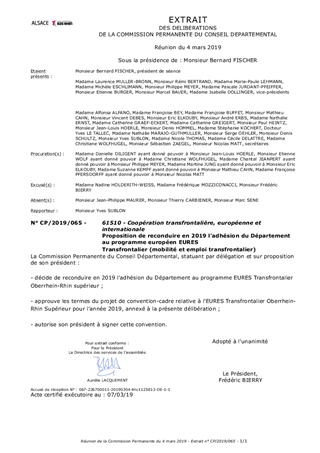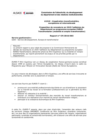 Le présent rapport a pour objet de proposer à la Commission Permanente de décider de reconduire en 2019 l'adhésion du Département au programme européen EURES Transfrontalier, démarche phare du Rhin Supérieur sur la mobilité et l'emploi transfrontalier, qui rejoint pleinement les enjeux et les priorités portés par le Département.