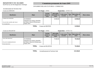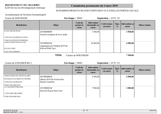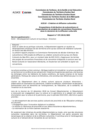 Dans le cadre de sa politique culturelle, le Département apporte un soutien au développement artistique de ses territoires ainsi qu'aux actions de médiation culturelle en faveur des Bas-Rhinois. Le présent rapport propose à la Commission Permanente de décider d'attribuer des subventions à 109 projets de diffusion ou création culturels ainsi qu'aux dix Relais Culturels du Bas-Rhin, pour un montant total de 829 210 €, d’approuver les termes des projets de conventions financières et de convention d'objectifs à conclure avec les Relais Culturels et l’association Décibulles, et d'autoriser son président à signer ces conventions.