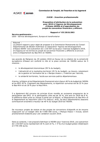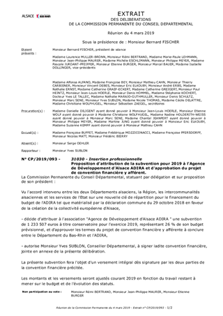 Le présent rapport a pour objet de proposer à la Commission Permanente du Conseil Départemental de décider d'attribuer à l'association "Agence de Développement d'Alsace ADIRA "une subvention de 1 233 507 euros pour l'exercice budgétaire 2019, et d'approuver les termes du projet de convention financière y afférente à conclure entre le Département du Bas-Rhin et l'ADIRA.