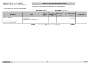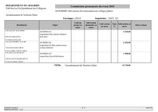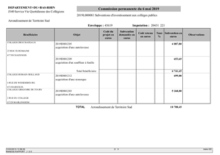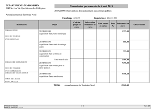 Le Département est responsable de la construction, de la reconstruction, de l'extension, des grosses réparations des bâtiments, de l'équipement, du fonctionnement, de l’accueil, de la restauration, de l’hébergement, de l’entretien général et technique, du recrutement et de la gestion des personnels techniciens, ouvriers et de service exerçant leurs missions dans les collèges publics du Bas-Rhin. Le présent rapport a pour objet de proposer à la Commission Permanente de décider d'attribuer des subventions d'investissement aux collèges publics pour l'acquisition d'équipements divers, pour un montant total de 48 283,25 €.