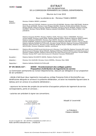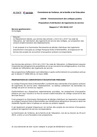 Le Département décide, aux termes des articles L.213-4 et L.213-7 du code de l'éducation, de l'attribution des logements de service des collèges, sur proposition des conseils d'administration des établissements. Il est proposé à la Commission Permanente de décider d'attribuer des logements actuellement inoccupés au collège Françoise Dolto à Reichshoffen, et d'approuver les termes des projets de convention d'occupation précaire correspondants.