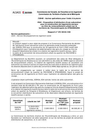 Le présent rapport a pour objet de proposer à la Commission Permanente de décider de l’attribution d’une subvention suite à la demande d’aide financière présentée par DOMIAL ESH pour la construction de 18 logements en PLA-I (Prêt Locatif aidé d’Intégration) pour l’opération de sédentarisation des gens du voyage au titre du dispositif départemental d’aide à la création de logements locatifs sociaux, dans le cadre de la convention de renouvellement urbain du quartier du POLYGONE à STRASBOURG.