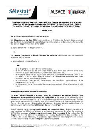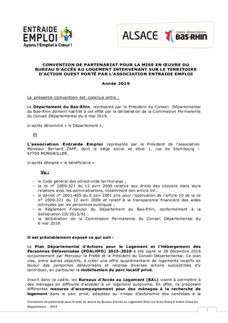 Le présent rapport a pour objet de proposer à la Commission Permanente de décider de la reconduction des partenariats et du renouvellement des aides financières du Département pour la poursuite des actions menées par les Bureaux d’Accès au Logement (BAL), au titre de la délégation des aides à la pierre de l'Etat et de la politique volontariste du Département aux structures suivantes : - l'association Entraide Emploi, intervenant sur le territoire d'action Ouest ; - le Centre Communal d’Action Social (CCAS) de Sélestat sur le territoire d’action Sud. Inscrit dans le plan départemental d'action pour le logement et l'hébergement des personnes défavorisées (PDALHPD), les BAL visent à permettre à des ménages en difficulté d'accéder à un logement autonome. Il est également proposé à la Commission Permanente d'approuver les termes des projets de conventions à conclure pour l’année 2019.