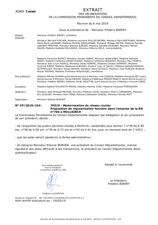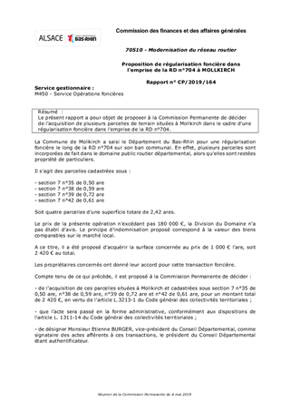 Le présent rapport a pour objet de proposer à la Commission Permanente de décider de l'acquisition de plusieurs parcelles de terrain situées à Mollkirch dans le cadre d'une régularisation foncière dans l'emprise de la RD n°704.