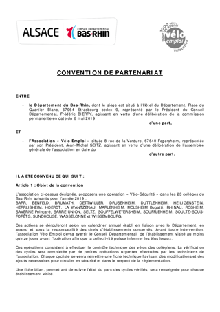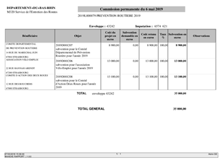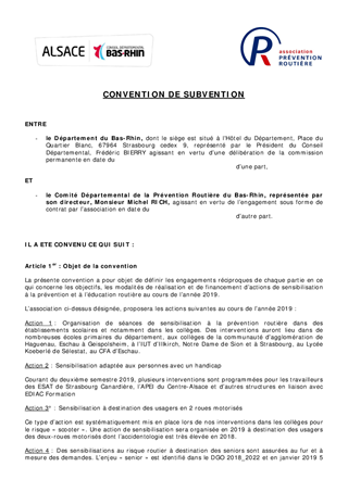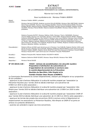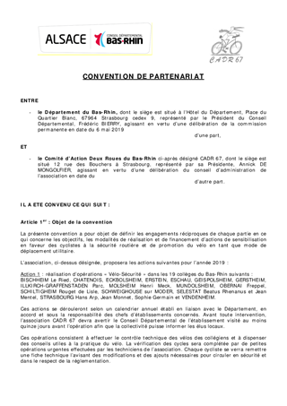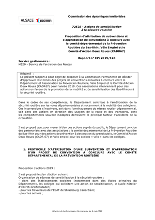 Le présent rapport a pour objet de proposer à la Commission Permanente de décider d’approuver les termes des projets de conventions annuelles à conclure entre le Département et l'association La Prévention Routière, Vélo Emploi et le Comité d'Action Deux Roues (CADR67) pour l'année 2019. Ces associations interviennent pour des actions en faveur de la promotion de la mobilité et de sensibilisation des Bas-Rhinois à la sécurité routière.